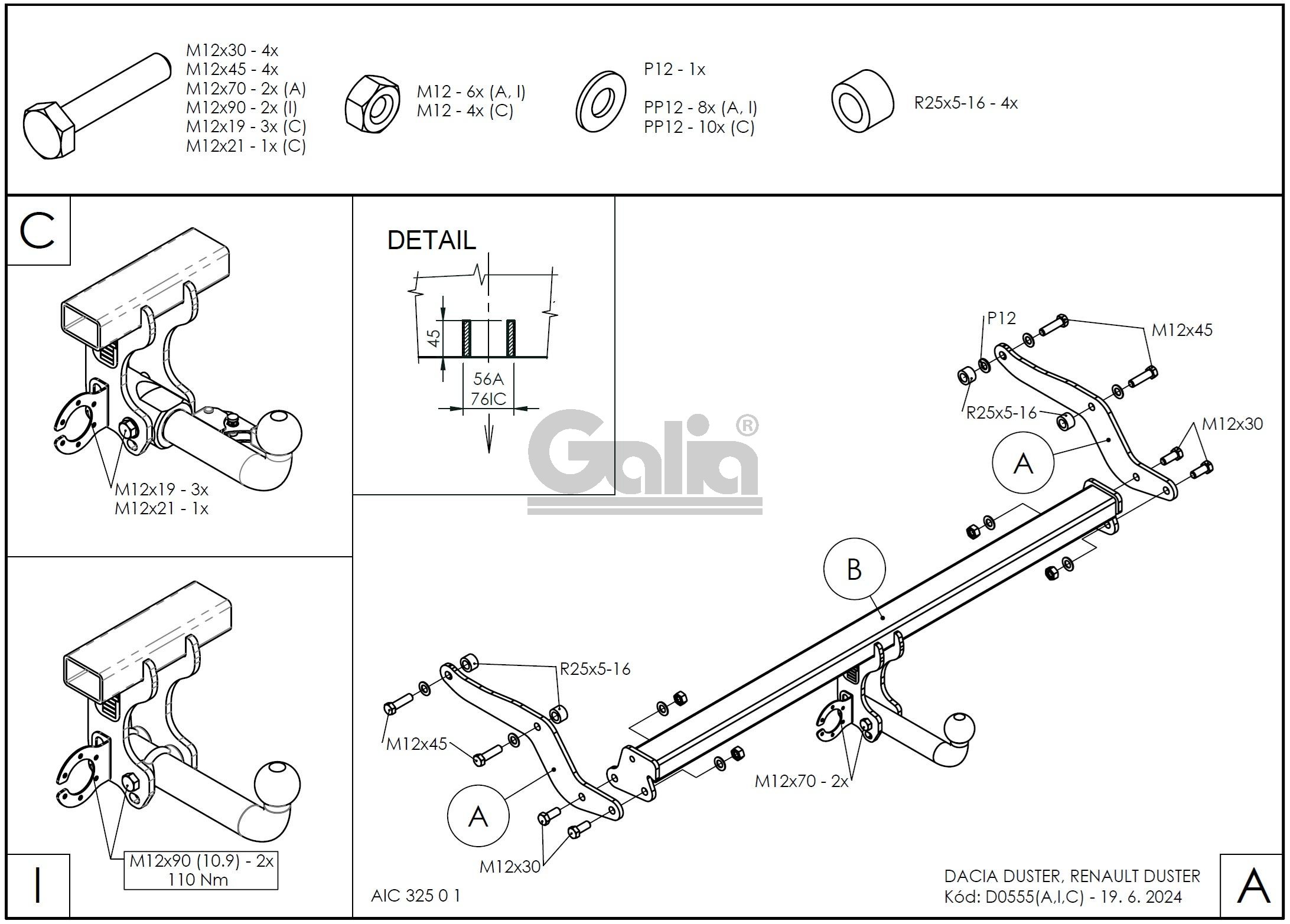 Hak holowniczy w całości ocynkowany, kula demontowalna, przykręcana śrubami.