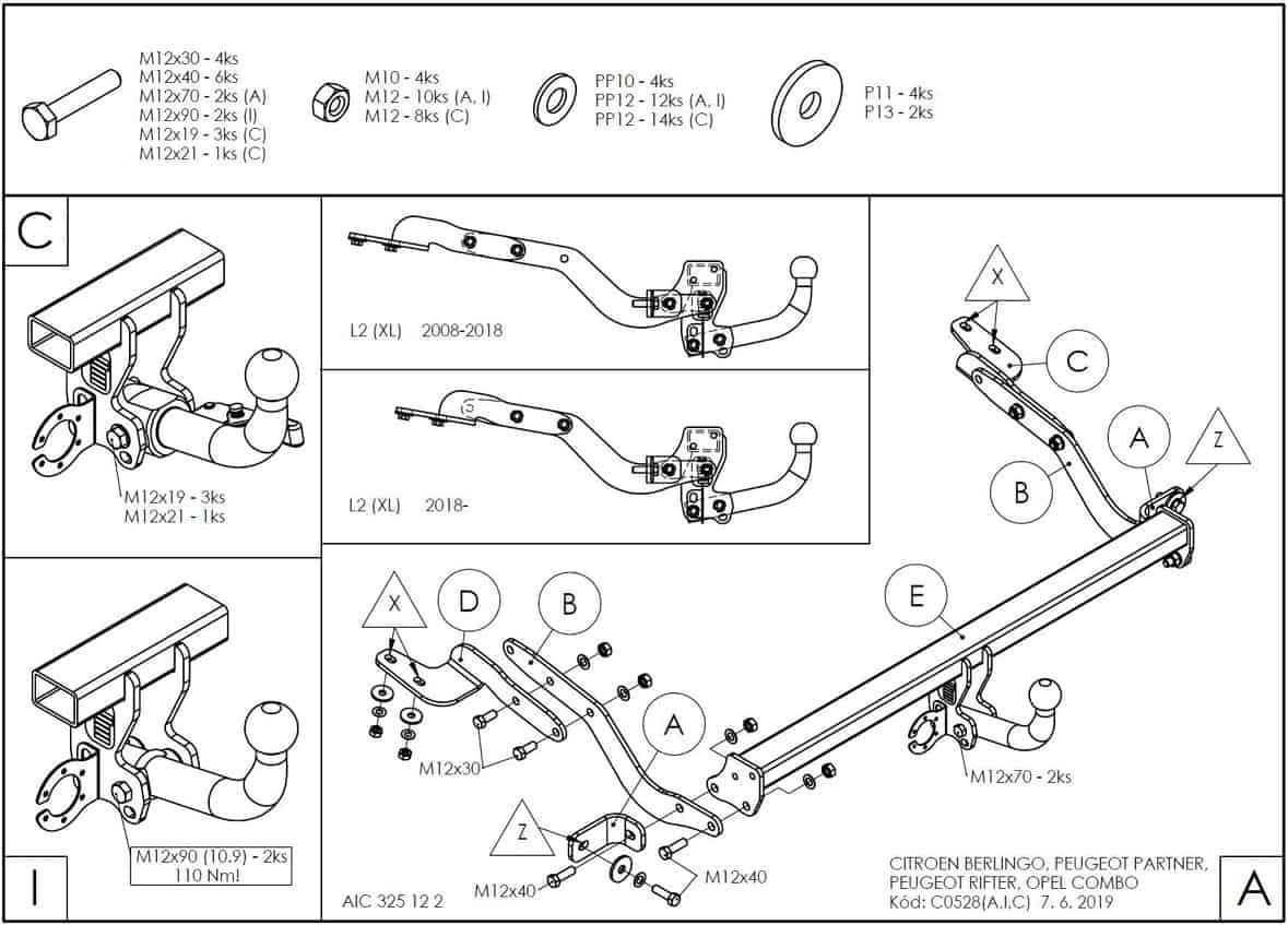 Hak holowniczy Galia, z kulą demontowalną automatycznie, bez użycia narzędzi do Peugeot Rifter od roku 2018. Wersja długa.