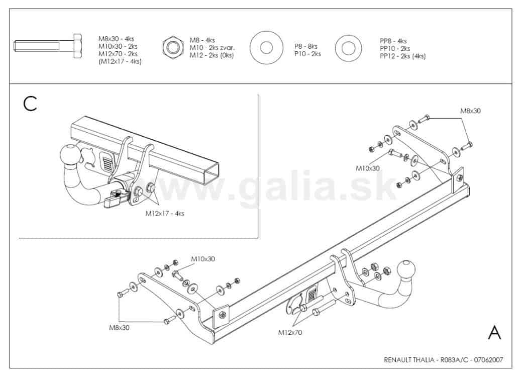 Hak holowniczy, w całości ocynkowany, z kulą demontowaną automatycznie, bez użycia narzędzi. W zestawie pokrowiec do przewożenia kuli w bagażniku. Pasuje do modeli 3 i 5 drzwi (htb.) oraz 4 drzwi (sedan)